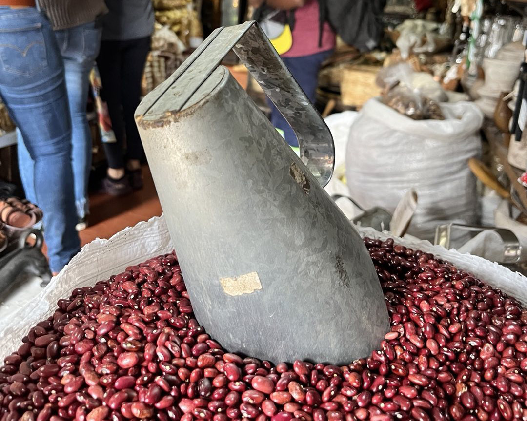 A concha que pesa o feijão, o arroz, a farinha, o fubá. Instrumento de trabalho, amiga inseparável das sacas de mantimentos, dos armazéns secos e molhados, das vendas e mercearias como a nossa. Concha que com tempo ganha cor, que faz barulho certo pra cada mercadoria e que a gente não fica sem.