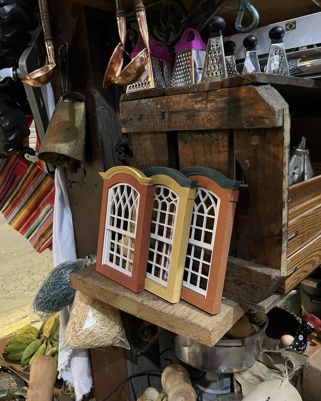 Aqui, nas bandas das Gerais, janela dão vista pros quintais. Delas se vê o galinheiro, a horta e os meninos brincando na gangorra do abacateiro. Mas as nossas janelas também se abrem pras ruas, pra ver quem tá chegando, pra colocar a colcha nas épocas de procissão e até pra esperar a banda passar. Pelas nossas janelas a gente vê os telhados de telhas-nas-cochas e, lá no fundo, até as montanhas. Nossas janelas dão vida nos casarios das ladeiras e até nas igrejas. Essas aqui, em miniaturas, são pra decorar a estante. Carregam com elas tudo isso e mais aquilo que ocê quiser ver pelas suas janelas.